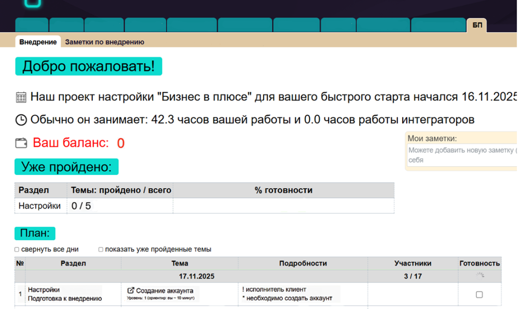 До загрузки графика внедрения в учебном курсе отсутствует информация. Далее компания Бизнес в плюсе добавляет в свою систему график внедрения, и в вашей системе сразу отображается информация.