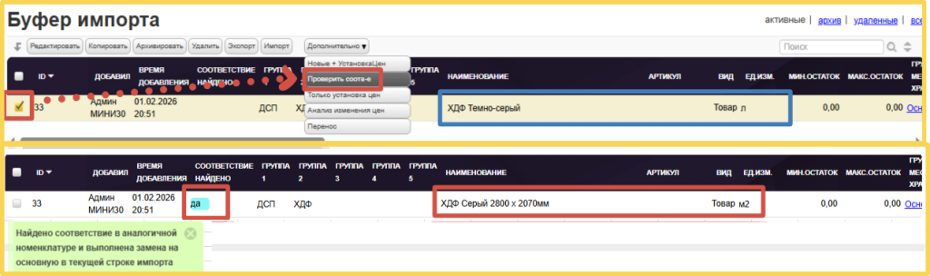 2. Добавить файл с аналогичной номенклатрой в таблицу "Буфер импорта" и проверить замену аналогичной номеклатуры.