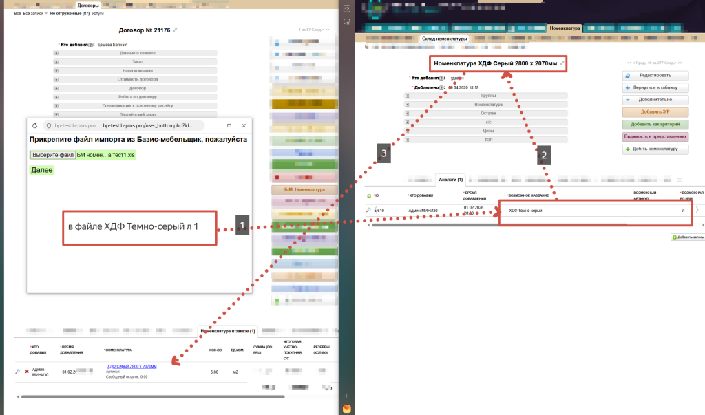 3. Добавить файл с аналогичной номенклатрой в таблицу "Договоры" через Доп. Действие "БМ Номенклатура" и проверить замену аналогичной номеклатуры.