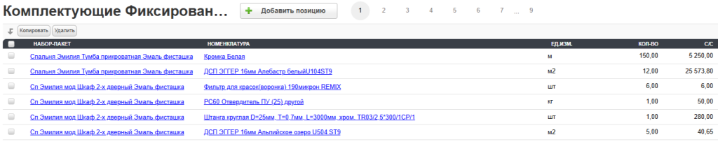 В таблице "Комплектующие фиксированные" содержится информация о всех номенклатурных позициях, которые являются фиксированными комплектующими, в привязке к конкретному набор-пакету.