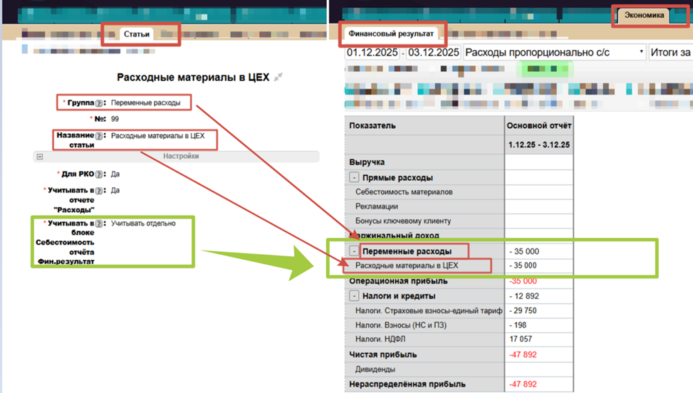 В поле " Учитывать в блоке Себестоимость отчёта Фин. результат" указываем нужное значение. Используется в отчете "Финансовый результат".