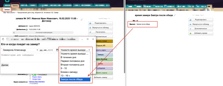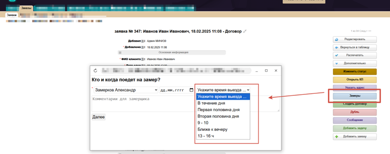 В табл. Заявки при нажатии ДД «Замеры» нам нужно указывать время выезда для замерщика.