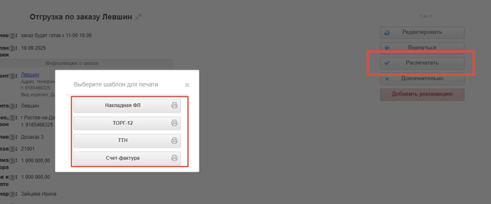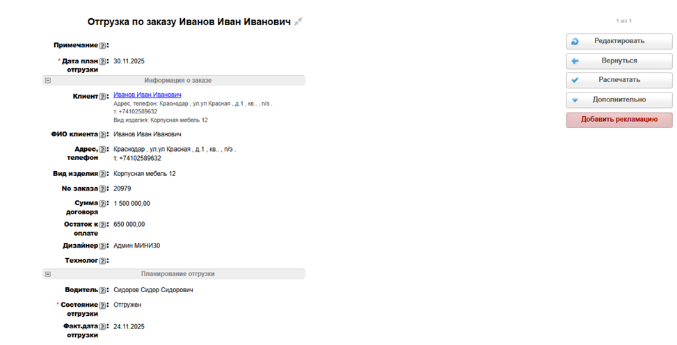 • Примечание — Поле для ответственного за отгрузки сотрудника.