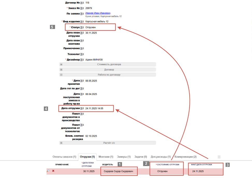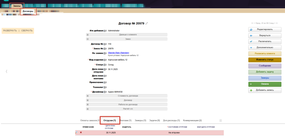 5. Статус договора автоматически поменяется на «Отгружен» (так настроен триггер, при желании можно отключить)