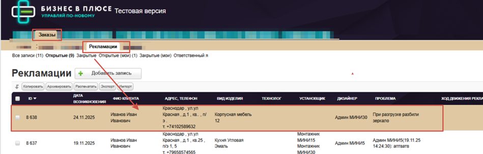 Создается новая запись или добавляется информация в уже имеющуюся запись в таблице "Рекламации".