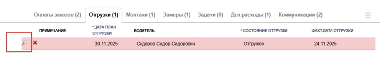 При нажатии значок «Лупа» можно увидеть подробности по отгрузке.