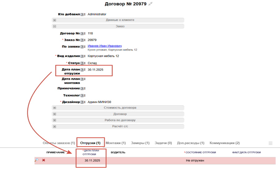 • Дата план отгрузки — Заполняет ответственный сотрудник. Поле дата план отгрузки в таблицах "Договоры" и "Отгрузки" взаимосвязаны.