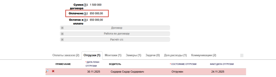 Запись в подтаблице «Отгрузки» подсвечивается розовой заливкой, так как заказ отгружен с задолженностью от клиента, т. е. нет 100% оплаты от заказчика.