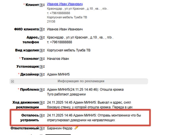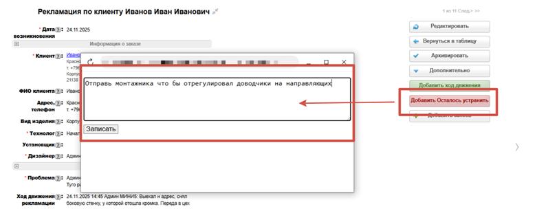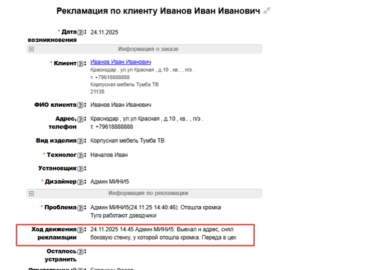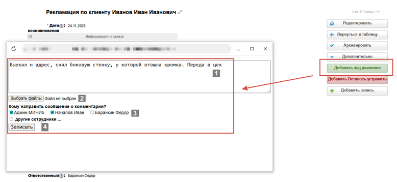 Информация добавиться в поле «Ход движения рекламации» с отображением даты, временем и имеем сотрудника, который добавил запись.