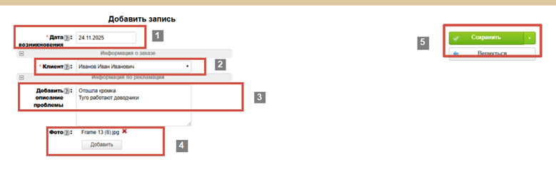 1. Дата возникновения - ответственный сотрудник указывает, когда возникла рекламация.