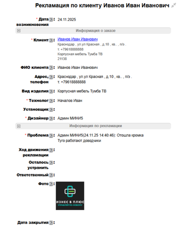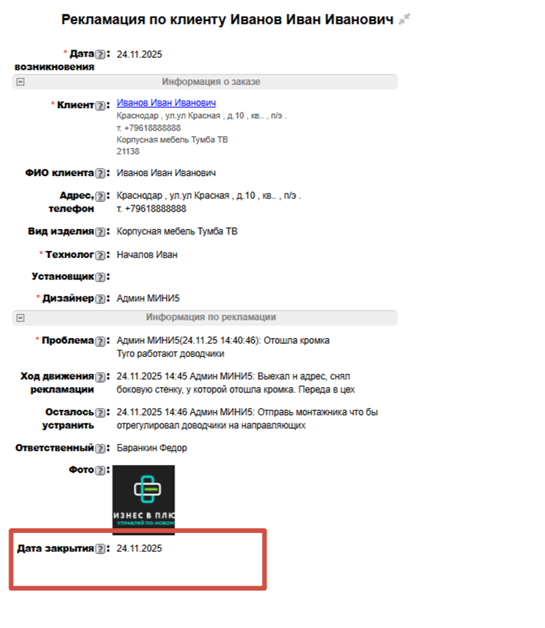 Дата закрытия - указывает ответственный сотрудник по контролю за рекламациями после закрытия рекламации.