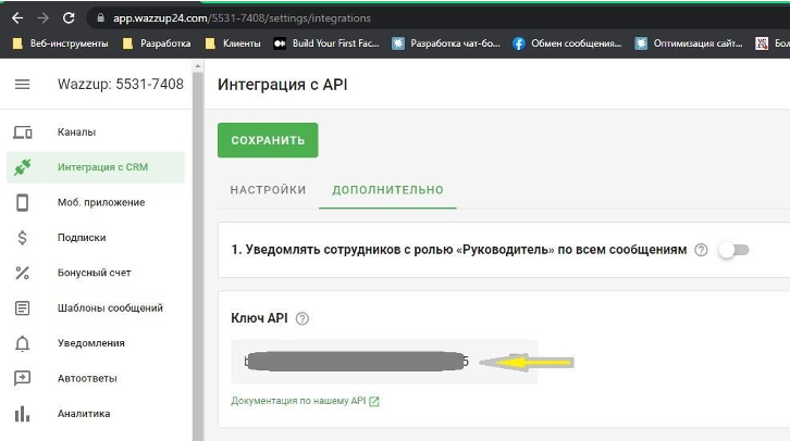 1. Получить API key, для этого зайти в раздел «Интеграция с CRM» и нажать вкладку «Дополнительно»: