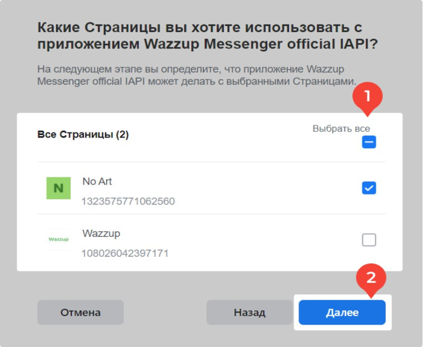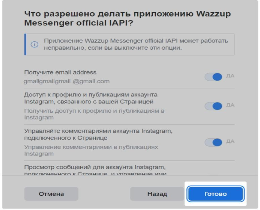 6. Оставьте включенными все ползунки. Если что-то отключить и не дать какие-то права приложению Wazzup Messenger Official API — канал будет работать некорректно.