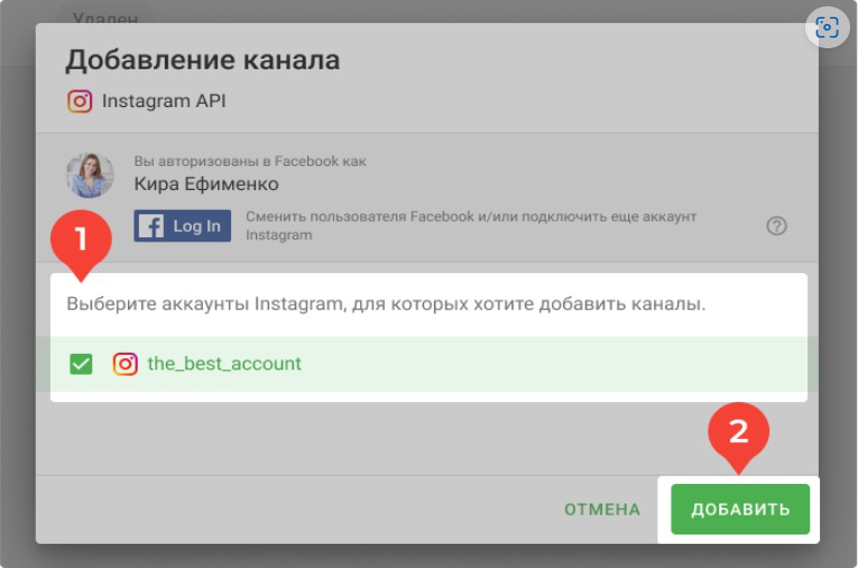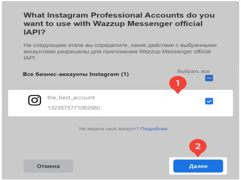 4. Выберите бизнес-аккаунт Instagram, для которого добавляете канал → «Далее». Можно выбрать сразу несколько аккаунтов.