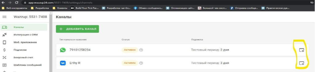 1. Перейдите в раздел «Каналы» личного кабинета Wazzup.