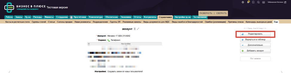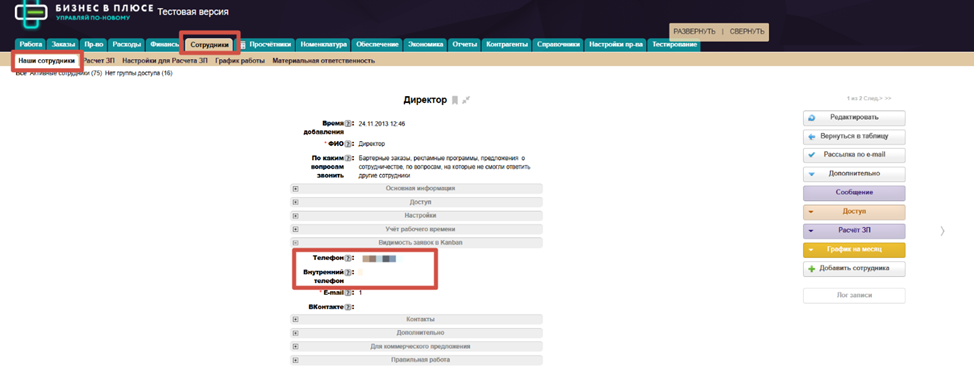 16. Далее заходим в категорию «Сотрудники», таблицу «Наши сотрудники» и переносим номера сотрудников из Мегафона в БП. Вносим номер телефона и внутренний телефон согласно тем, что указаны в виртуальной АТС.