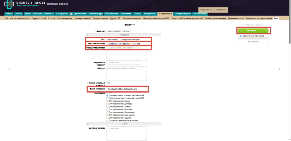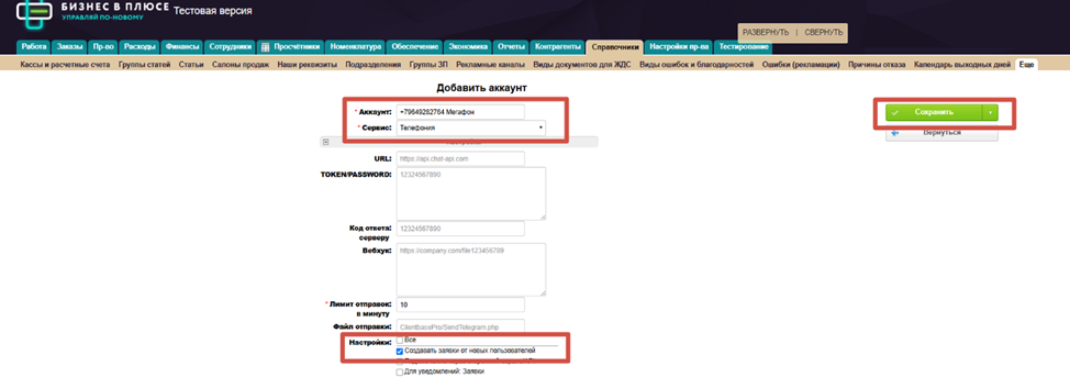 13. В поле «Аккаунт» пишем номер телефона и пометку Мегафон. В поле сервис выбираем Телефония. В настройках ставим галочку «Создавать заявки от новых пользователей». Сохраняем.