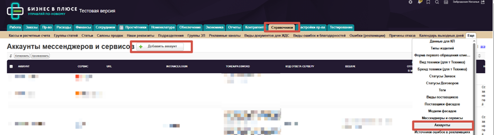 12. Заходим в категорию «Справочники»—таблицу «Аккаунты» и нажимаем «добавить аккаунт».