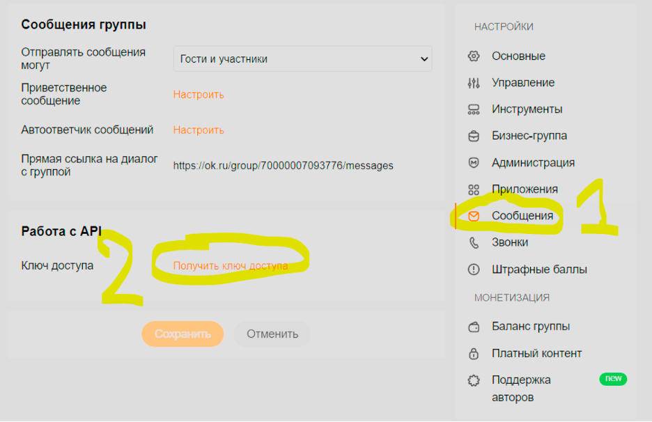 3. Зайдите в Сообщения и нажмите «Получить ключ доступа». ВАЖНО — если у вас уже есть другая интеграция с другим сервисом, этот ключ собьётся и ОК присвоит новый ключ доступа. Замените ключ на новый в том сервисе:
