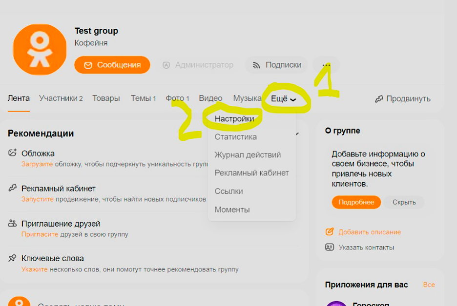 1. Зайдите в группу в ОК, которую необходимо подключить, далее нажмите Ещё — Настройки: