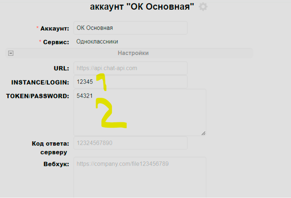 5. После сохранения нажмите "Редактировать" и укажите ID группы и ключ доступа в полях «INSTANCE/LOGIN» и «TOKEN/PASSWORD» соответственно: