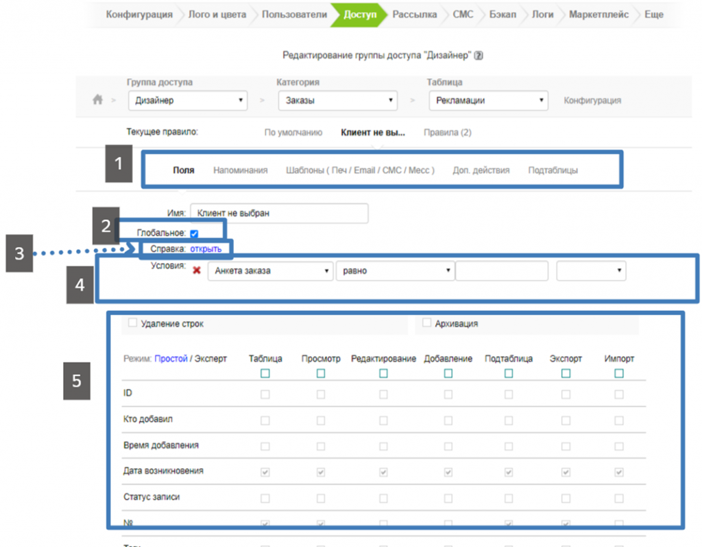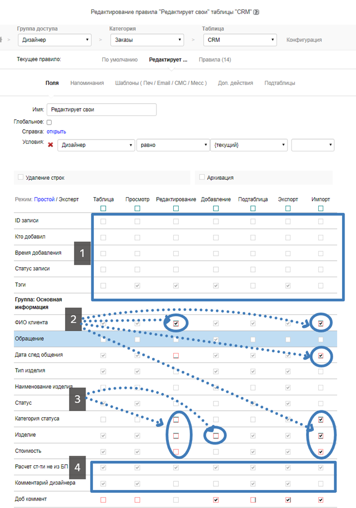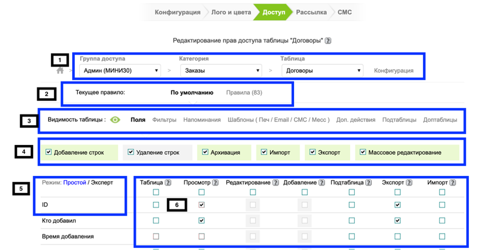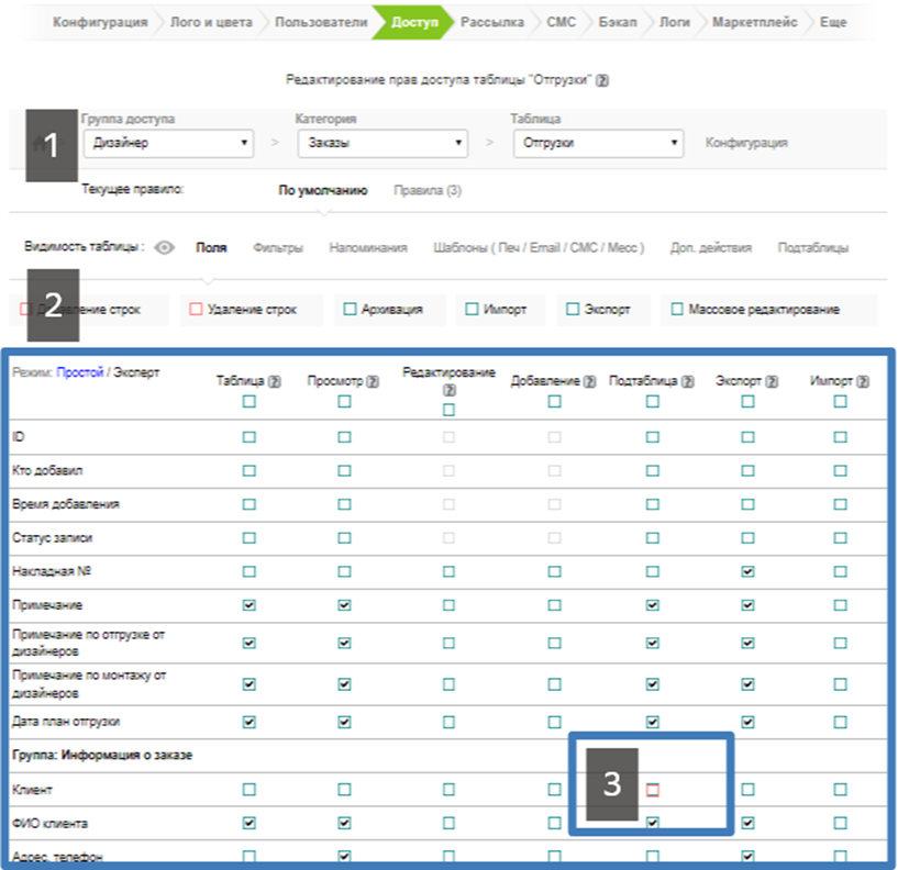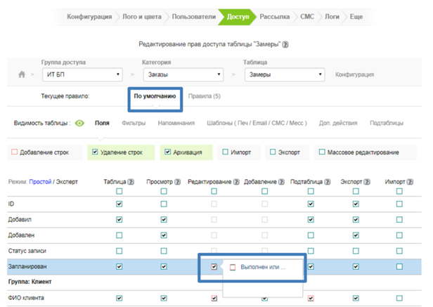 2. В таблице отображаются все поля таблицы. Устанавливая флаги под "таблица", "просмотр", "редактирование" и т.д. сначала нужно перейти в режим "эксперт".