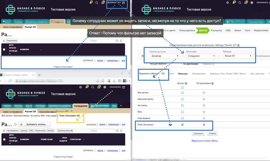 При редактировании настроек рекомендуем работать сразу в 2 окнах. Слева от доступа Админ, справа от сотрудника с редактируемым доступом.