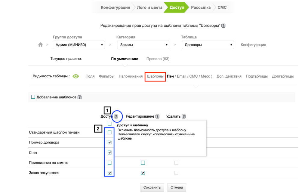 Для шаблонов печати при нажатии на "Распечатать" в таблицах отображаются только те формы, к которым есть доступ в настройках.