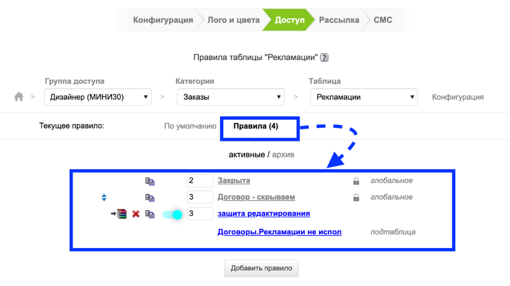Для того, чтобы увидеть все правила, относящиеся к данной таблице, необходимо перейти в режим "Правила".