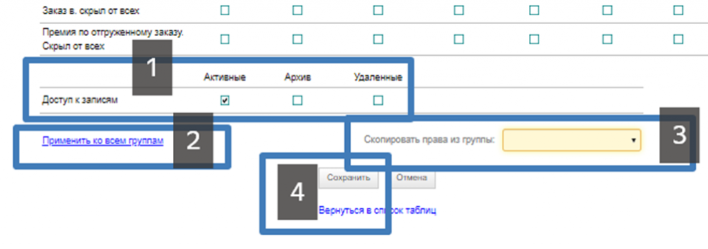 1. Указать доступ записям Активным, Архивным, Удаленным