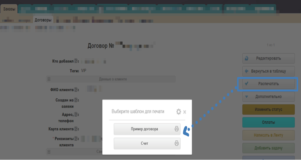 Пример отображения шаблонов печати по кнопке "Распечатать" в таблице "Договоры":