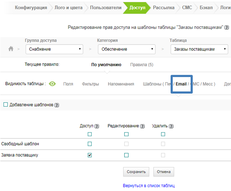 2. Выбираем флагами шаблоны, для которых нужно открыть доступ.
