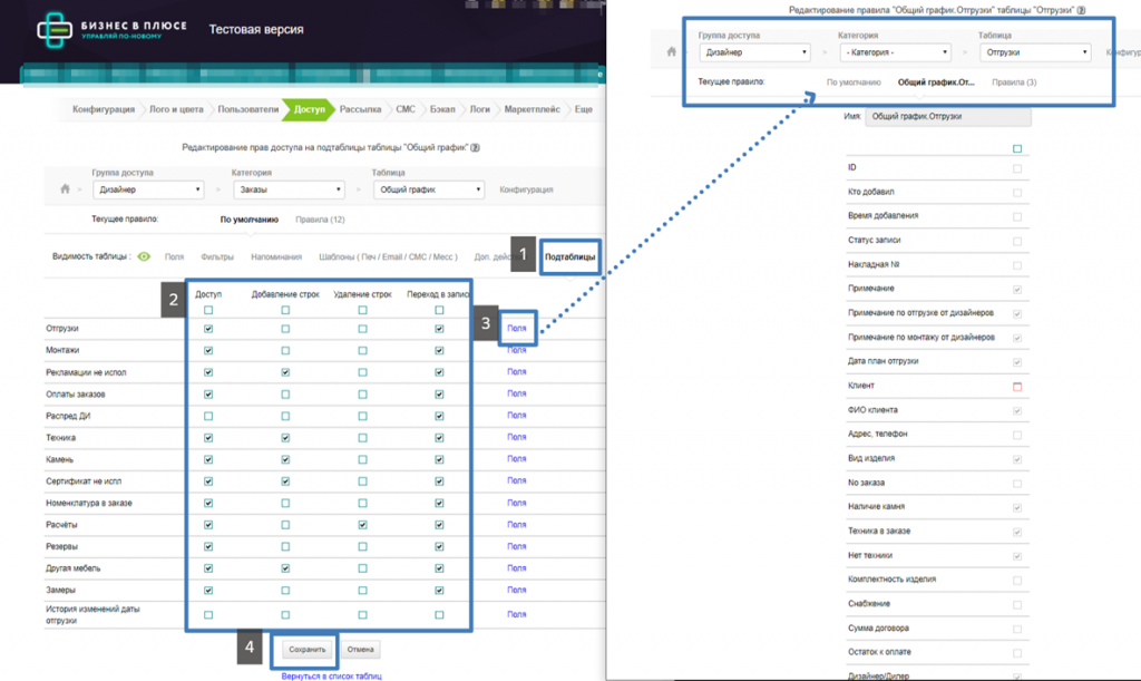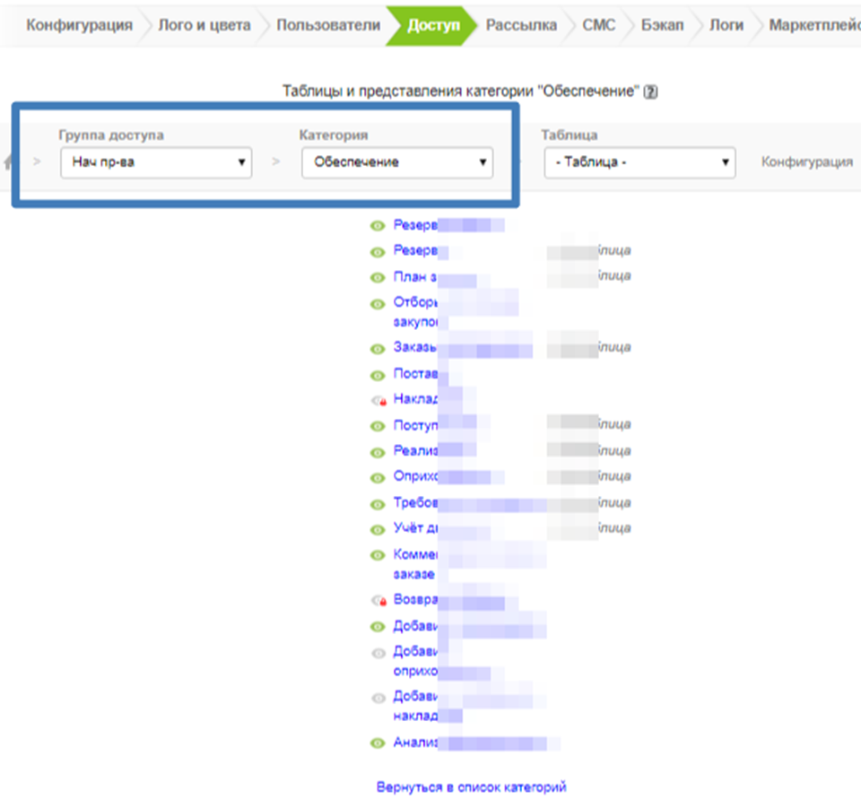 1. Выбираем группу доступа и таблицу, которую нужно настроить