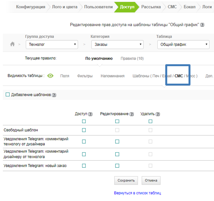 Рядом с "Шаблоны" выбираем тип "Печ", "Email", "СМС", "Месс"