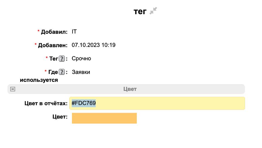 Теги отображают особые признаки, по которым можно охарактеризовать записи в различных таблицах (заявки, договоры, поставщики и пр.). Например, VIP, Срочно, Черный список и т.д.