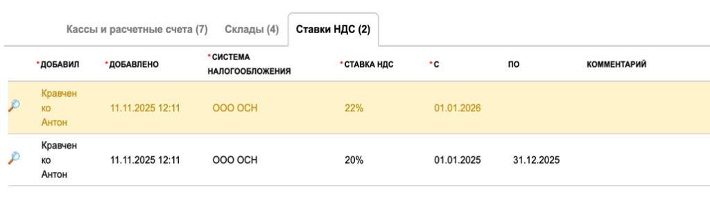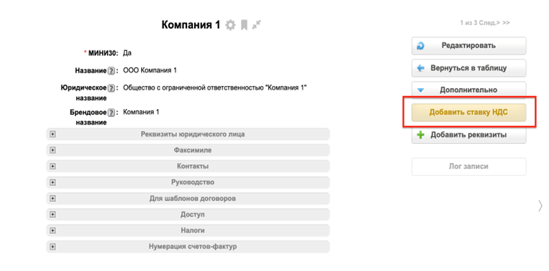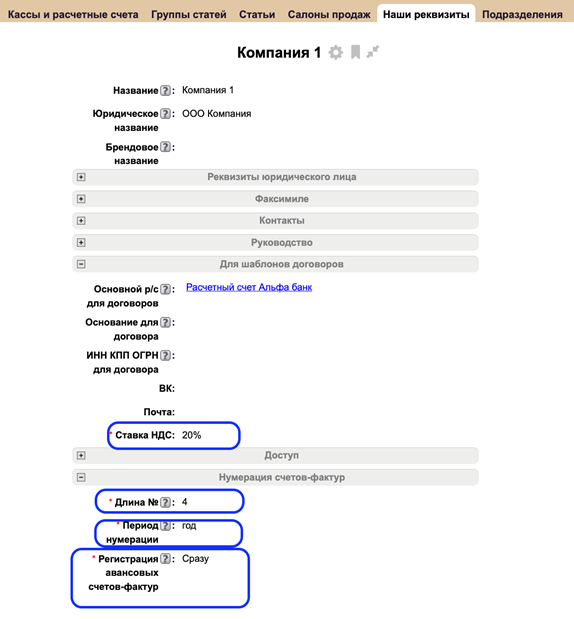 - Ставку НДС - выбор значений основной ставки, по которой работает компания- Без НДС, 0%, 5%, 7%, 10%, 20%, 22%;