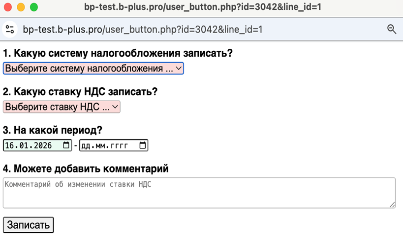 - Систему налогообложения - выбор значения из списка;