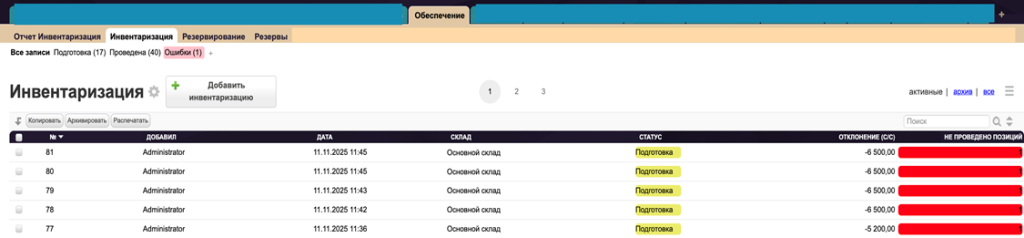 В системе есть возможность проводить инвентаризацию в разрезе складов, а также инвентаризировать не только товары, но и упаковки.