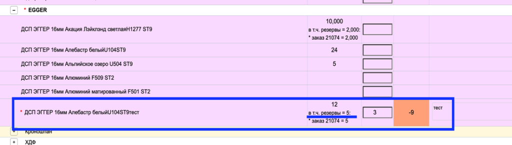 В данном примере видно, что фактическое кол-во номенклатуры 3,0, при этом в резерве 5,4.