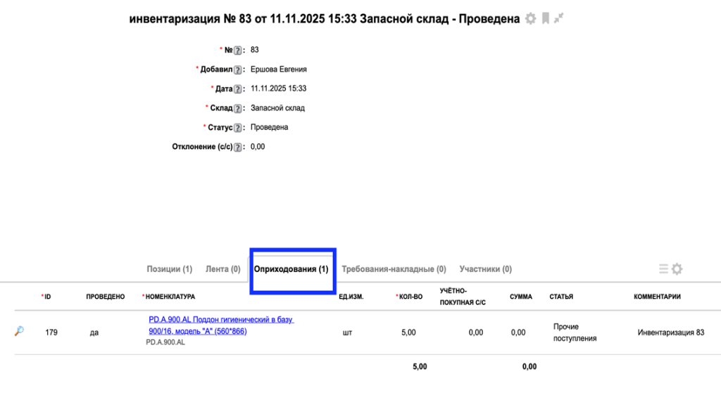 Если в результате инвентаризации был обнаружен излишек какой-либо номенклатуры, то при проведении Инвентаризации автоматически создается Оприходование номенклатуры. Если был обнаружен излишек Упаковки, Оприходование создаваться не будет.