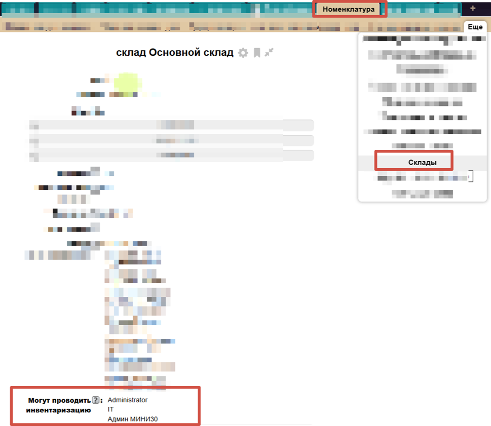 Для того, чтобы у сотрудника была возможность проводить инвентаризацию на определенном складе, нужно настроить доступ к складу в таблице Склады.