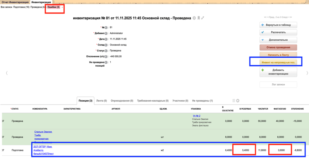 При проведении Инвентаризации Требования-накладная не создана. Данная запись по инвентаризации попала в фильтр "Ошибки".