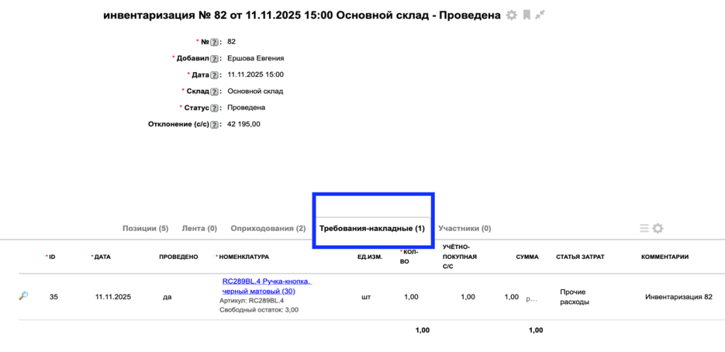 Если в результате инвентаризации был обнаружен недостаток какой-либо номенклатуры, то при проведении Инвентаризации автоматически создается Требование-накладная номенклатуры. Если был обнаружен недостаток Упаковок, Требование-накладная создаваться не будет.