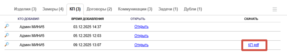 Если при работе в отчете "КП" Вы сохранили его через кнопку "Сохранить в PDF", то файл буде прикреплен в подтаблице, если же КП не было сохранено в PDF, то файла не будет. Из подтаблицы файл можно скачать, не заходя в отчет КП.