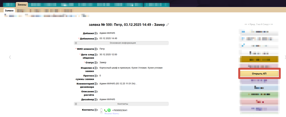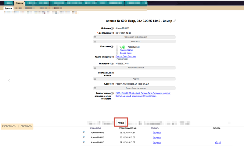 15. Все коммерческие предложения созданные по заявке будут храниться в подтаблице КП которая находится в таблице "Заявки". Здесь Вы можете открыть ранее созданные КП, создать из них копию, сохранить или распечатать.