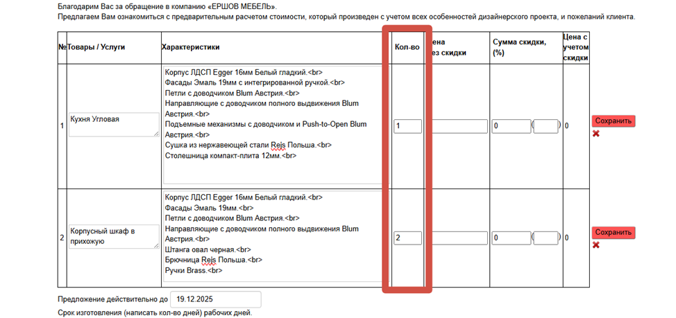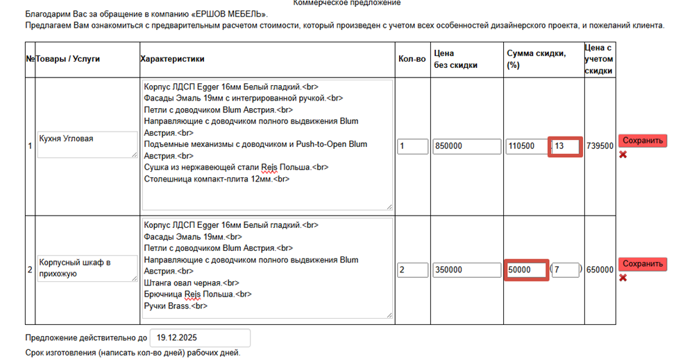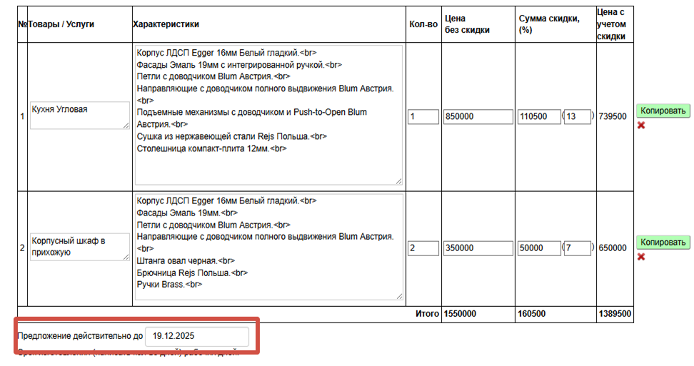 9. Под таблицей с основной информацией об изделиях есть окошко с датой "Предложение действительно до:" здесь необходимо указать дату для клиента до какого числа будет действительно коммерческое предложение.