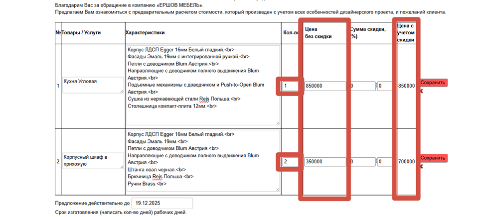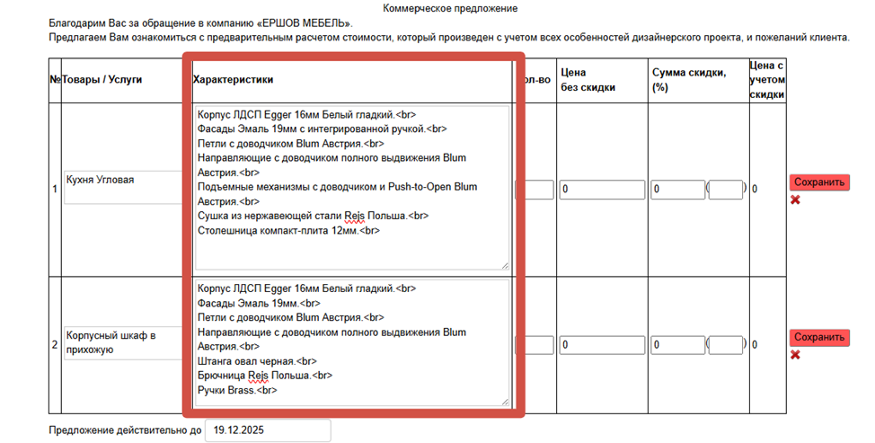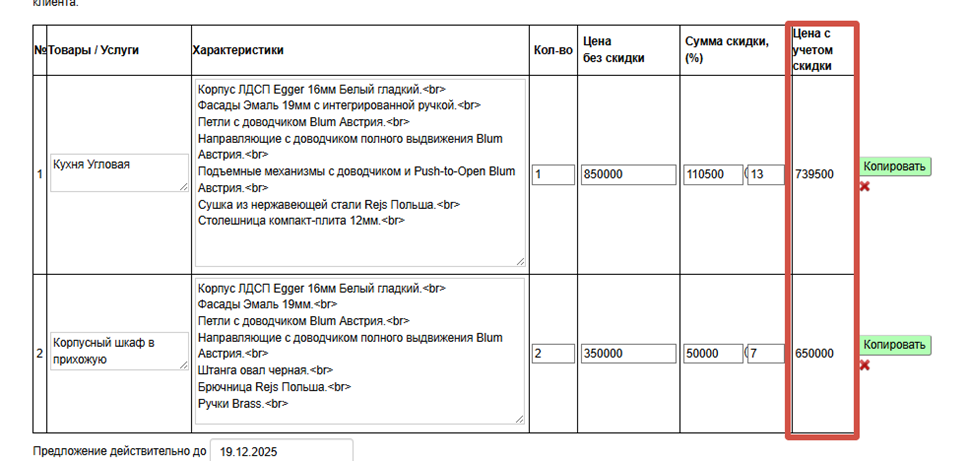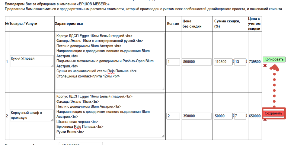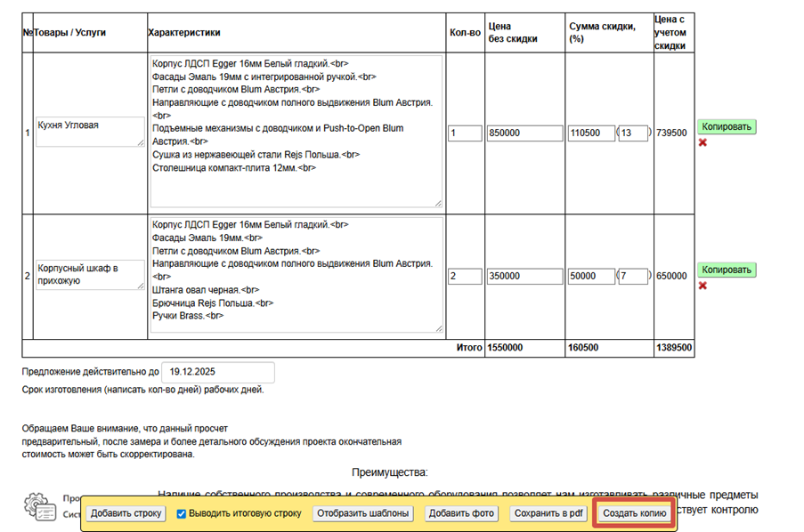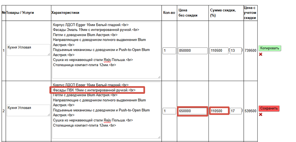 Копирование строки можно использовать, например если клиент попросил просчитать одно изделие в нескольких вариантах. После копирования вся информация заполненная ранее будет отображаться в новой строке и Вам не нужно заполнять все заново, а лишь внести изменения. Например, изменить характеристики, цену (скидка останется такой же в рублях как была, поэтому стоит обратить внимание и подкорректировать, чтобы избежать ошибок).