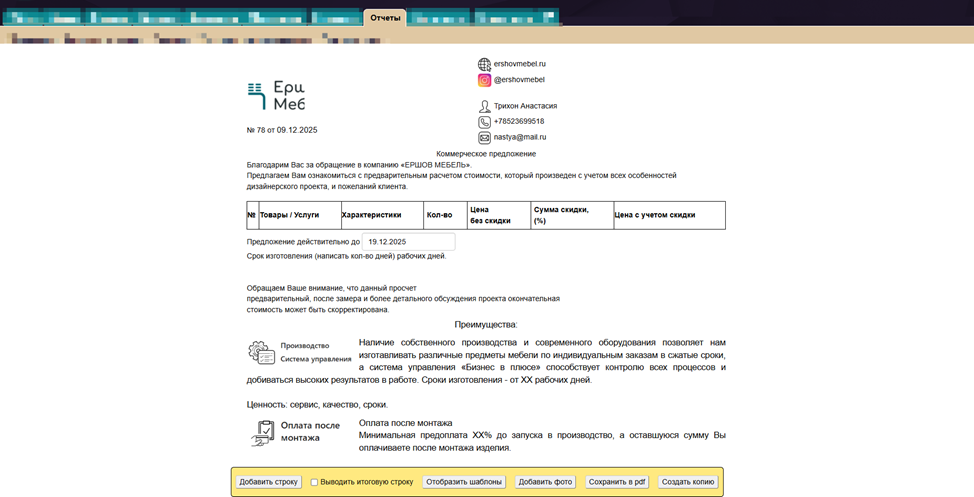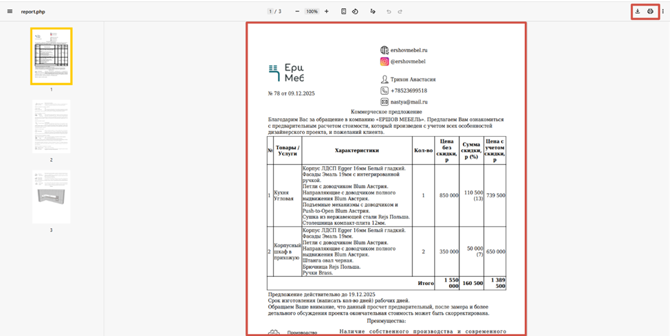 В новой вкладке в браузере откроется PDF файл с готовым коммерческим предложением которое можно сохранить на компьютер или распечатать.