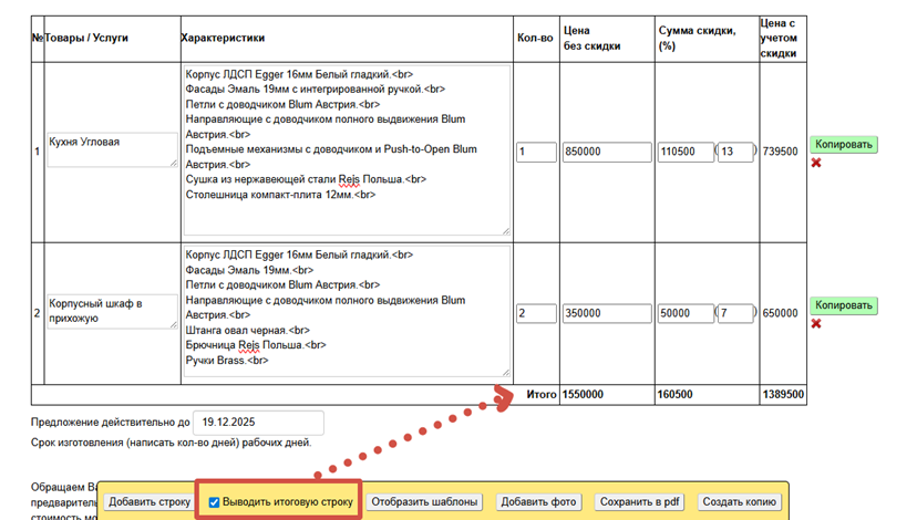 10. Если в КП просчитаны разные изделия, то можно вывести итоговую сумму за все изделия. Для этого необходимо проставить галочку на панели желтого цвета внизу страницы. У Вас просчитается общая сумма без скидки, сумма скидки и сумма изделий с учетом скидки.