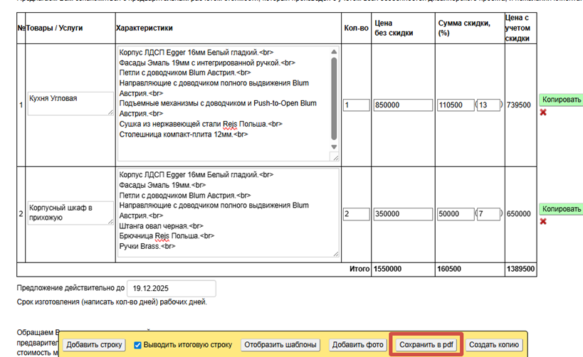13. Далее нам необходимо сохранить наше КП для того, чтобы распечатать или отправить клиенту. Для этого на панели снизу нажимаем на кнопку "Сохранить в PDF".